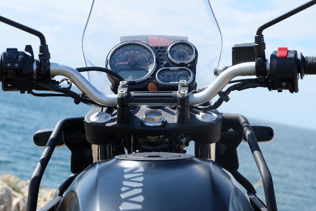 Bütünleştik, tepede ne gidecek, rüzgardan nasıl etkilenecek, virajda frenajda ne yapacak sorularını kafamda sıralarken göstergeye baktım 140 km/s hıza oturmuşuz. Şu söylediğim önemli; arkadan sertçe itilmiyor, önden yumuşak bir şekilde çekiliyormuşsunuz gibi. Tek silindir 411 cc motorun balansı çok iyi, titreşim yok denecek kadar az. Digital-analog karışık kokpitte vites göstergesi bile var. Hatta pusula var, bir motosiklette pusula varsa maceraya hazır olun demektir.